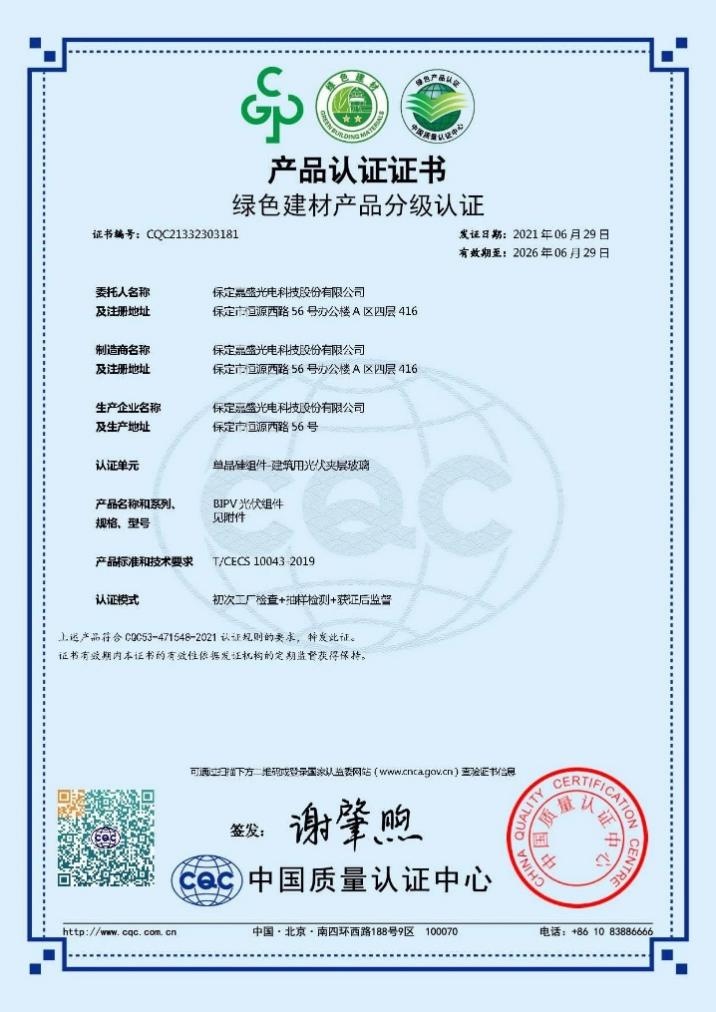 6月29日,中國質(zhì)量認證中心(CQC)向河北保定嘉盛光電科技股份有限公司(以下簡(jiǎn)稱(chēng)嘉盛光電)頒發(fā)了證書(shū)編號為CQC21332303181的綠色建材產(chǎn)品認證證書(shū),該證書(shū)是BIPV行業(yè)的第一張綠色建材認證證書(shū)。這標志著(zhù)BIPV產(chǎn)品從此有了更加規范的認證管理,無(wú)疑將助推BIPV技術(shù)及光伏綠色建材產(chǎn)品在建筑上的廣泛應用,助力“雙碳”目標在建筑行業(yè)更快速的實(shí)現。