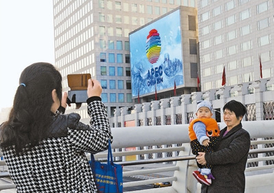 APEC會(huì )標成為北京新的城市景觀(guān)。圖為市民在奧林匹克公園附近的LED巨屏播放的APEC會(huì )標前拍照留念。