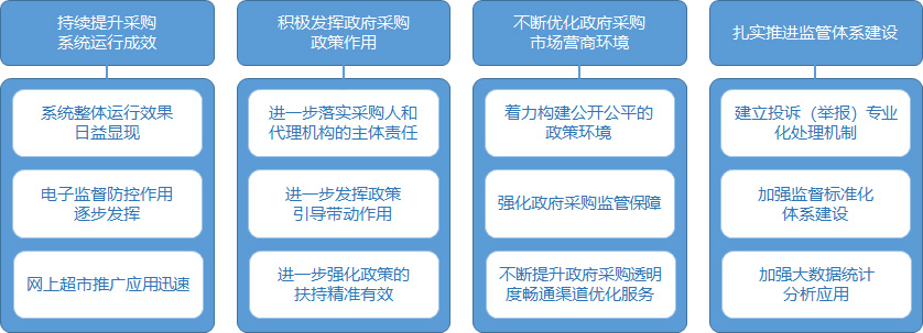 政策制度體系覆蓋政府采購預算管理、需求管理、政策功能實(shí)施、采購執行過(guò)程管理、監督管理等各個(gè)方面,建立起采購文件、合同文件、信息公告、檔案材料等一系列標準范本體系,確立了依法采購的市場(chǎng)規則,有效規范了政府支出行為和政府采購市場(chǎng)交易秩序。