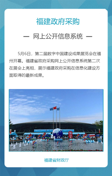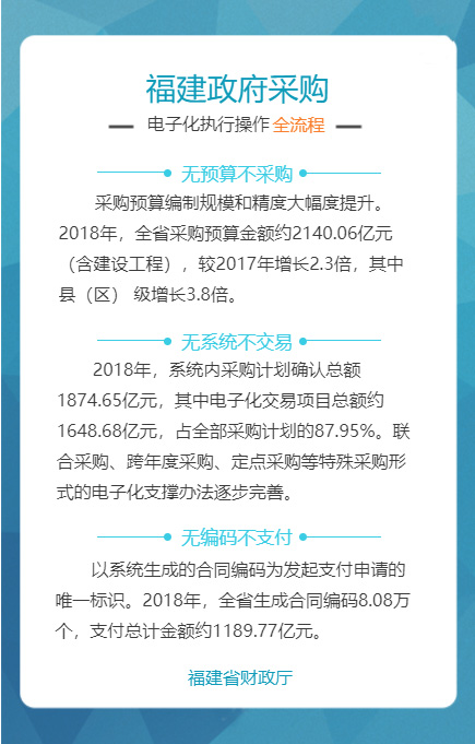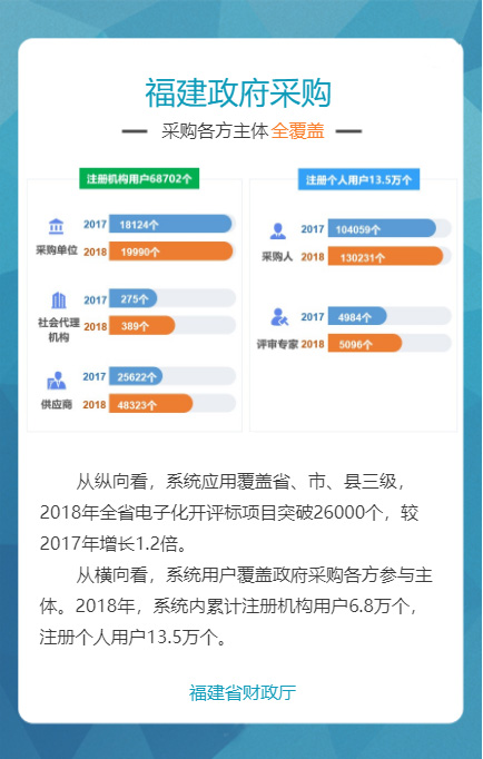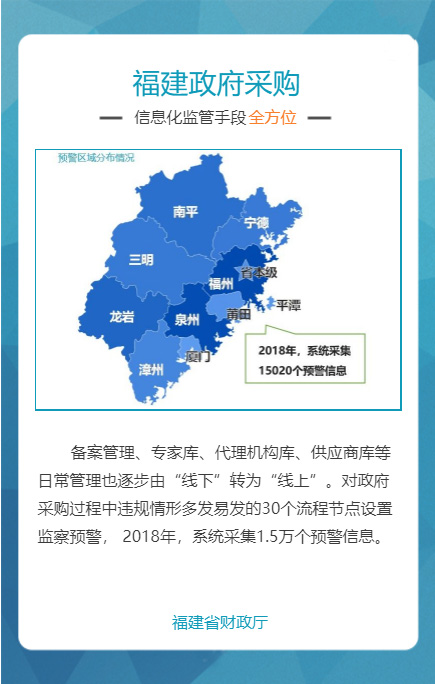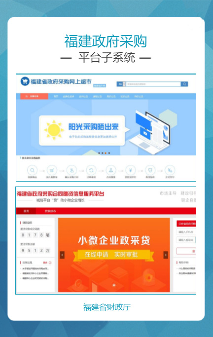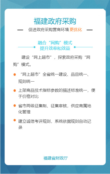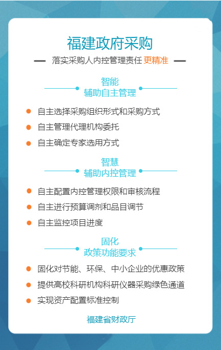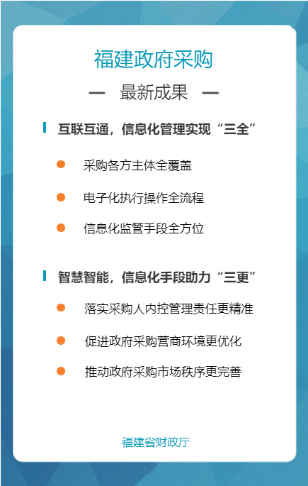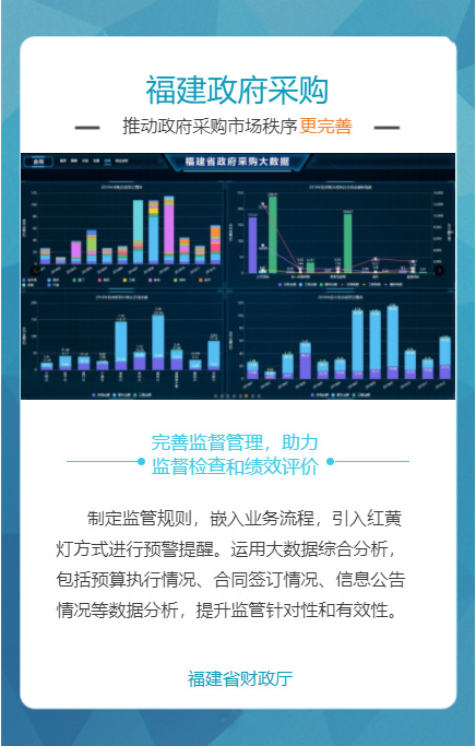 “福建省政府采購網(wǎng)上公開(kāi)信息系統”是針對政府采購活動(dòng)中存在的采購效率低、價(jià)格高、采購期長(cháng),以及各種不規范問(wèn)題而組織建設的,通過(guò)充分運用云計算、大數據、電子商務(wù)等新技術(shù)新業(yè)態(tài),創(chuàng )新體制機制,整合共享資源,管理創(chuàng )新獲得國務(wù)院領(lǐng)導肯定。