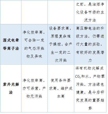 表3 主要油煙凈化方法比較的抽進(jìn)排出,或經(jīng)過(guò)濾網(wǎng)掛一點(diǎn)油,結果是:抽進(jìn)油煙,機內充滿(mǎn)油煙和灰塵,吐出油煙。油煙凈化設備則配備有凈化裝置:凈化板,進(jìn)行絕大部分油煙分離。離心風(fēng)機,濾化板殘余部分二次油煙分離。結果是:抽進(jìn)油煙,油、水和灰塵分離出來(lái),不被收集,機內不進(jìn)油煙和灰塵,吐出凈氣。