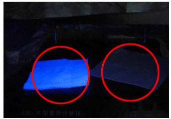 一般來(lái)講,木漿或混合漿的顏色應是象牙白,添加了熒光增白劑的以次充好的再生紙產(chǎn)品,顏色會(huì )白的不是很自然,很雪白的那種。通??梢杂抿炩n器照一下,如果紙巾泛藍紫色的光,通常都是添加了過(guò)量的熒光增白劑,您就趕緊停用吧。