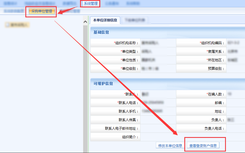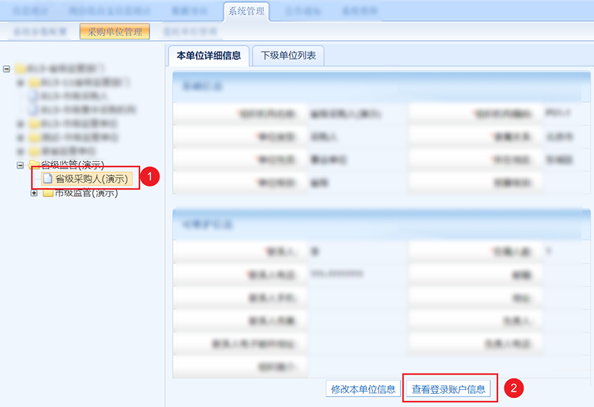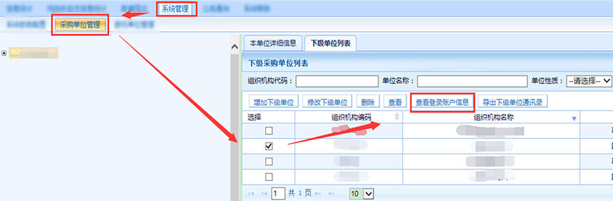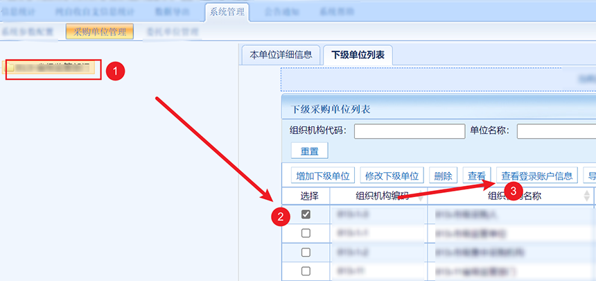 方法一,在左側組織樹(shù)找到下級單位并選中,然后點(diǎn)擊查看登錄賬戶(hù)信息。