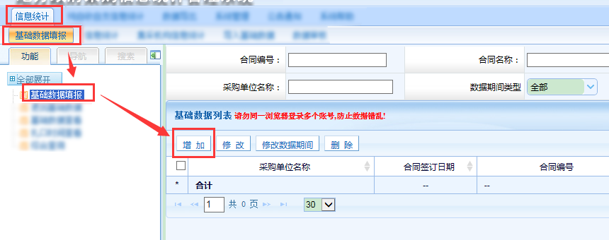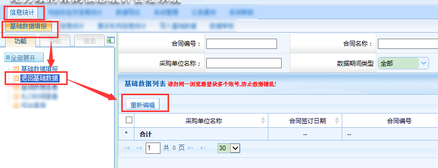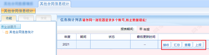 第四步,下級單位上報數據后,監管單位在其他合同信息統計頁(yè)面接受匯總報表。