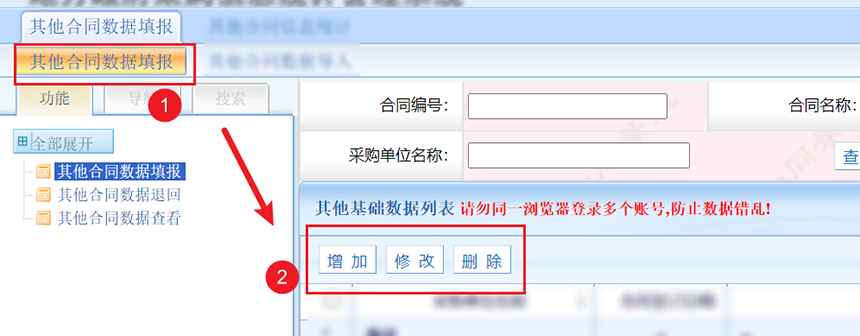 第二步,點(diǎn)擊其他合同數據填報進(jìn)行數據錄入,由于其他合同只在年末錄入,所以填報時(shí)不用選擇數據期間,錄入頁(yè)面類(lèi)似普通合同(其他合同不用錄入合同編號與合同名稱(chēng))。