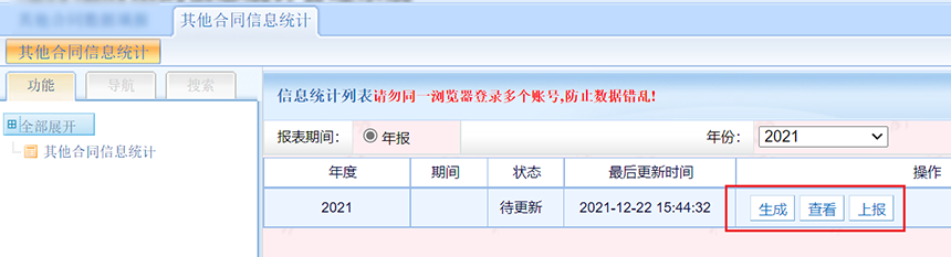 第三步,點(diǎn)擊其他合同信息統計生成報表(其他合同只有年報,沒(méi)有季報),生成完成,檢查數據無(wú)誤后,點(diǎn)擊上報按鈕上報數據。