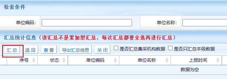 接收數據完成后,點(diǎn)擊匯總按鈕,系統彈出匯總頁(yè)面,全部勾選數據后,點(diǎn)擊匯總按鈕,完成匯總。