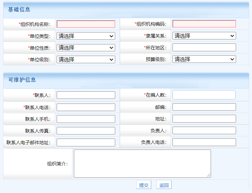 第二步,錄入下級單位信息,其中組織機構編碼在系統中唯一,其中單位類(lèi)型、單位性質(zhì)、單位級別影響系統功能和報表統計,請謹慎選擇。