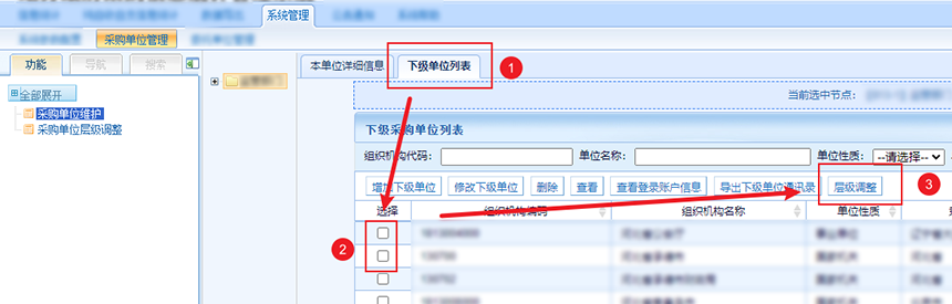 首先,在下級單位列表選擇要遷移的下級單位,然后點(diǎn)擊層級調整。